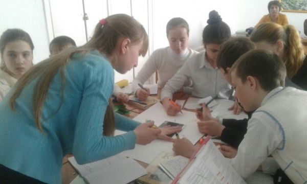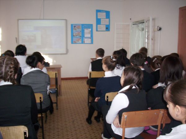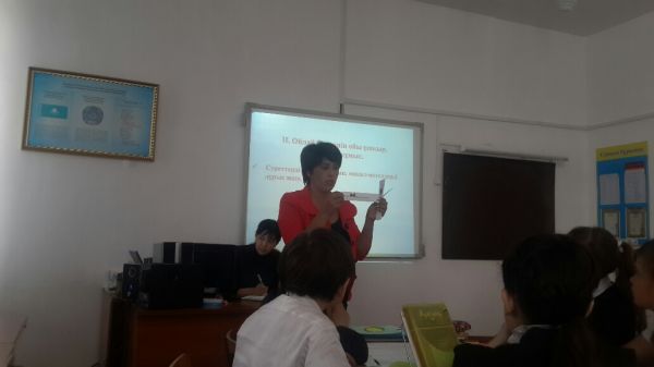 Мектептегі 8"б" сыныбындағы қазақ әдебиеті сабағынан көрініс: Сабақтың тақырыбы: "Шыңғыстаудың үш шыңы". Сыни тұрғыдан ойлау.