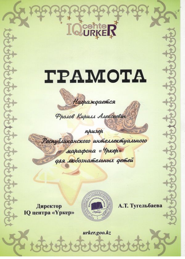 Награждается Фролов К.А., Терещенко Ю.С., Биктемиров Р.А. призеры и Ищенко А.К., Ерлан Т. победители Республиканского интеллектуального марафона "Үркер" для любознательных детей.