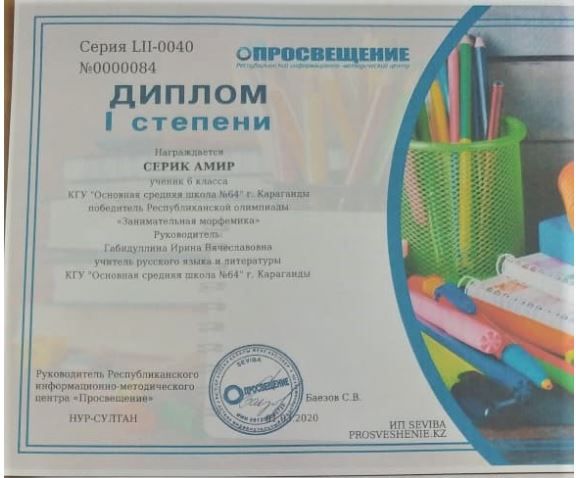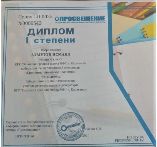 Орыс тілі пәні бойынша қашықтықтан өтетін республикалық олимпиада жеңімпаздарын құттықтаймыз! 1 дәрежелі дипломмен6 а сынып оқушылары Ахметов И., Серік А. марапатталды.