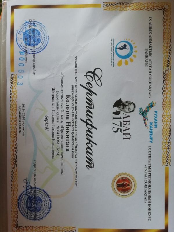 8"б" сынып оқушысы Колотов Никита Қазақстанның рухани ойшылы Абай Құнанбаевқа 175 жыл толуына арналған 9-шы ашық аймақтық" Туған соқпақтар" сайысына қатысты. Өз жұмысында Никита…