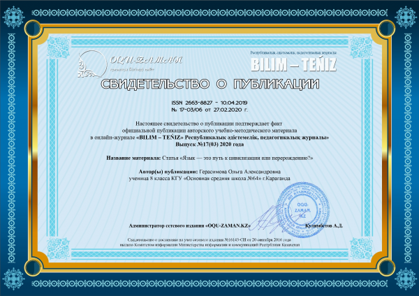 8 А сынып оқушысы О. Герасимованың жұмысы "BILIM — TEŃIZ" атты республикалық журналында жарияланды.