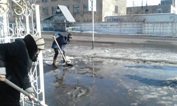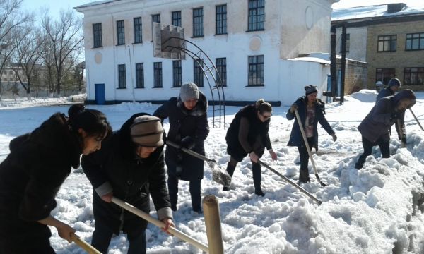 Ежедневно с территории школы убирается снег.Учителя школы вышли на субботник.