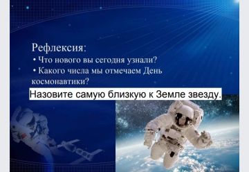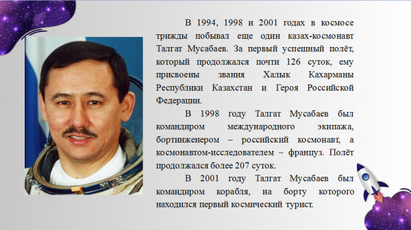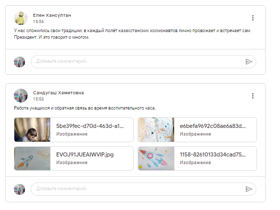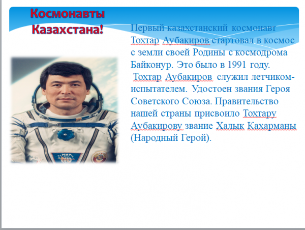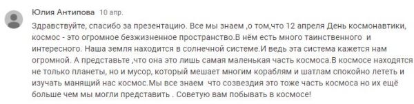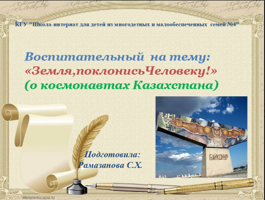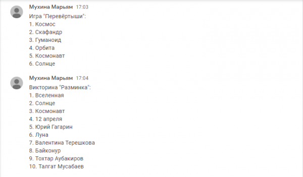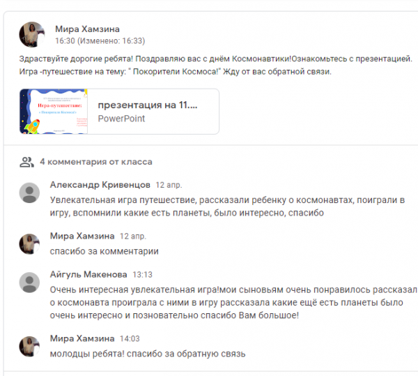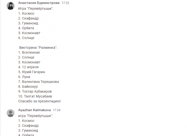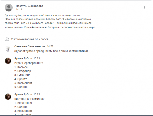 Космос человечеству 12.04.2021 года,  на платформе Гугл класс, среди 8-9 классов ( членов Жас Ұлан, Адал Ұрпак, Ученического самоуправления), воспитателем Омербаевой  Н.Е. был проведенча…