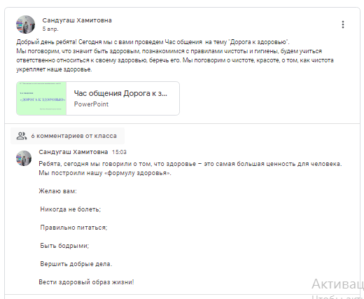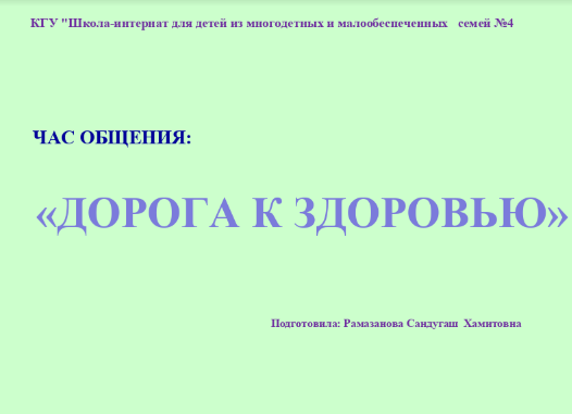 Час общения   «Дорога к здоровью»   07.04.2021 года,  на платформе Googleclassroom, среди учащихся 5-7 классов воспитателем Рамазановой С.Х. был проведен час о…