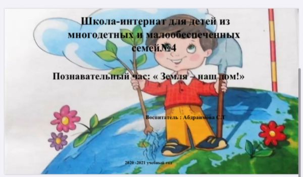 Земля наш дом ! 6 апреля, на платформе Googleclassroom,  был  проведен  классный час  на тему : «Земля наш дом ! ». Цель и задачи: формировать у детей экологическ…