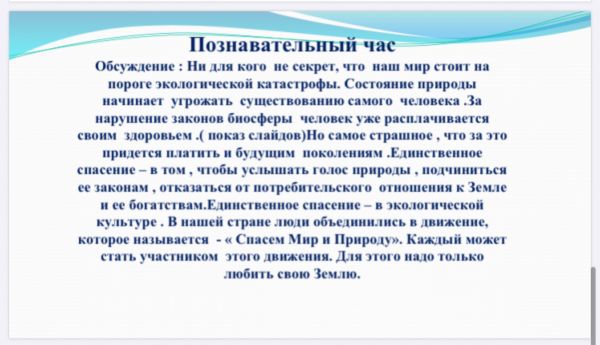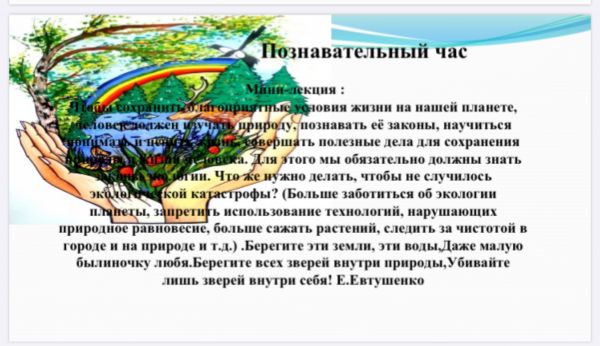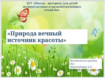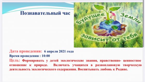 Природа вечный источник красоты   08.04.21, на платформе Googleclassroоm, воспитателем Маштыбаевой.А.Е, среди уч-ся 1-3 классов, был проведен воспитательный час на тему "Приро…