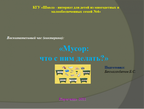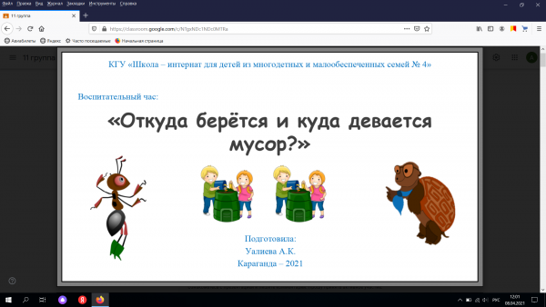 Мусор: что с ним делать?       06.04.2021 г., на платформе Googleclassroom, среди учащихся  8 классов, воспитателем Нурмаганбетовым Б.С.  был проведён воспитательны…