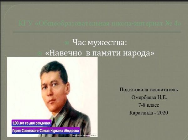 05 мая, на платформе Гугл класс, среди 7-8 классов воспитателем Омербаевой Н.Е., был проведен час мужества: «Навечно в памяти народной», посвященный…