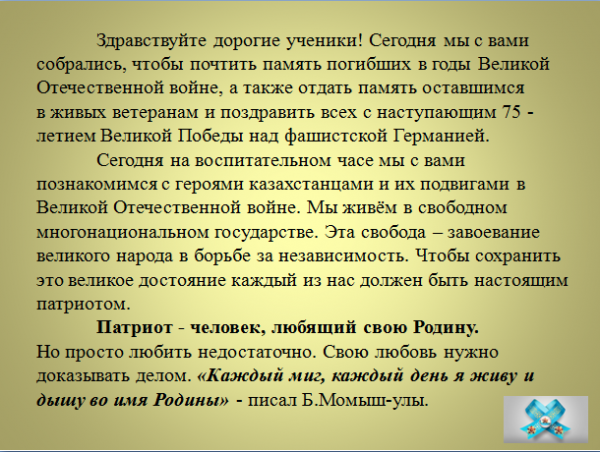 05.05.2020 года, в группе № 3 (2 -3 кл.) Хамзиной М.Ж. ,к 75- летию Победы в ВОВ был проведён воспитательный час на тему :«Никто не забыт ,…