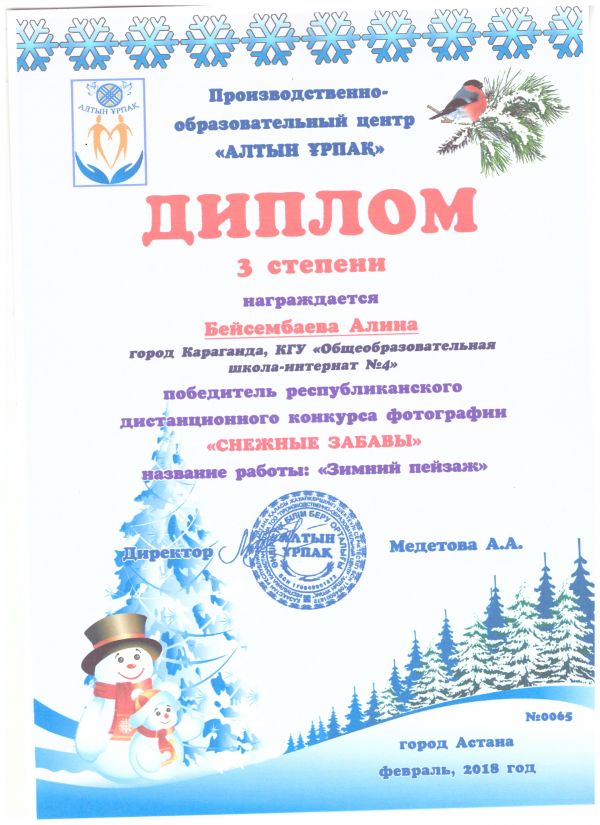 Поздравляем победителей республиканского дистанционного конкурса фотографий «Снежные забавы»: Бейсембаеву Алину (3кл), Мухину Марьям (4кл), Тубол Арину (3кл), Брэ…