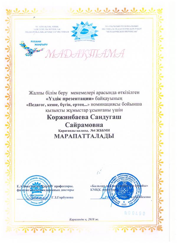 № 4 ЖББ МИ – ның 3 сынып оқушысы Бейсембаева Алина Республикалық оқу-әдістемелік орталығының ұйымдастыруымен «Рухани жаңғыру» бағдарламас…
