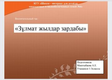 19.05.2021г, на платформе Google classroom, среди учащихся 1-3 классов, воспитателем Маштыбаевой. А.Е, был проведен воспитательный час: "Зұлмат жылдар зардабы &…