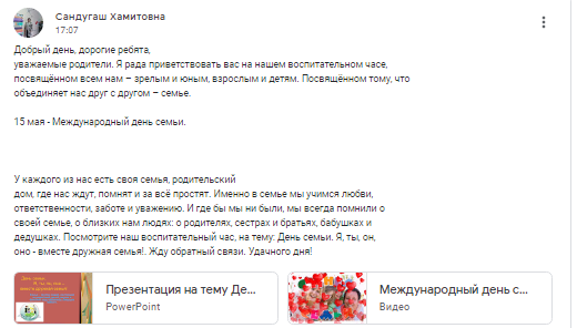14.05.2021г, на платформе ГУГЛ класс, среди учащихся 1-3 классов, воспитателем Маштыбаевай.А.Е, был проведен воспитательный час"Моя семья- моё богатство&…