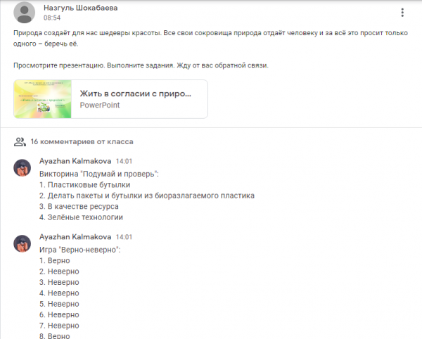 На платформе Гугл классрум,была проведена дискуссия на тему : «Мое место в природе ».