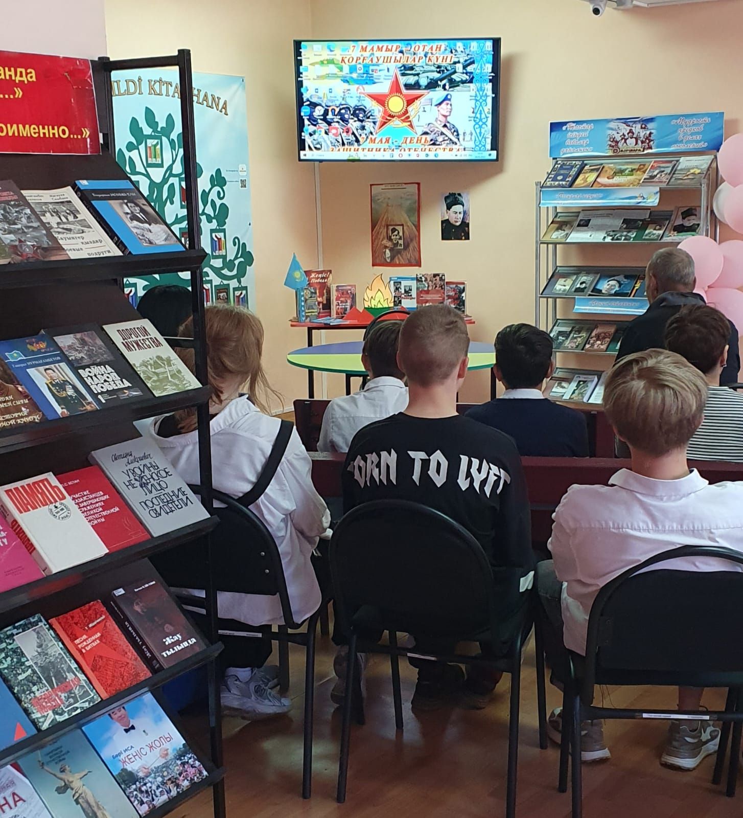 4.05. 2023 жылы №16 КММ кітапхана-филиалында «Отан қорғаушылар күніне» 4 орта мектеп-интернат оқушылары мен Отан қорғаушыларына арналған «Ал сен сабырлы бол – Елім» атт…
