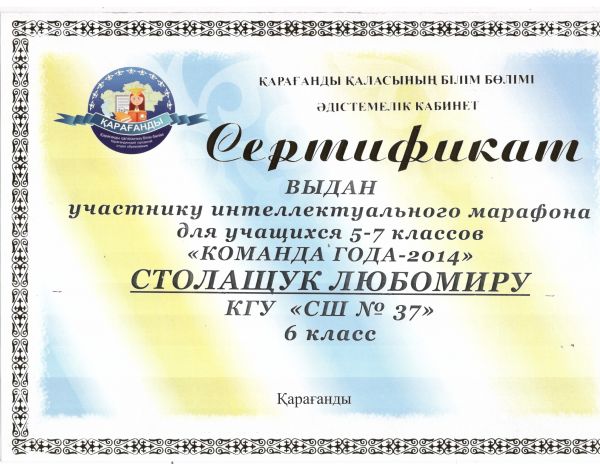 19 апреля учащиеся Основной школы №37 Столащук Любомир (6 класс), Жексембаева Дана (5 класс) и Федоров Роман (7класс) приняли участие в интеллектуальном марафоне "Команда года".