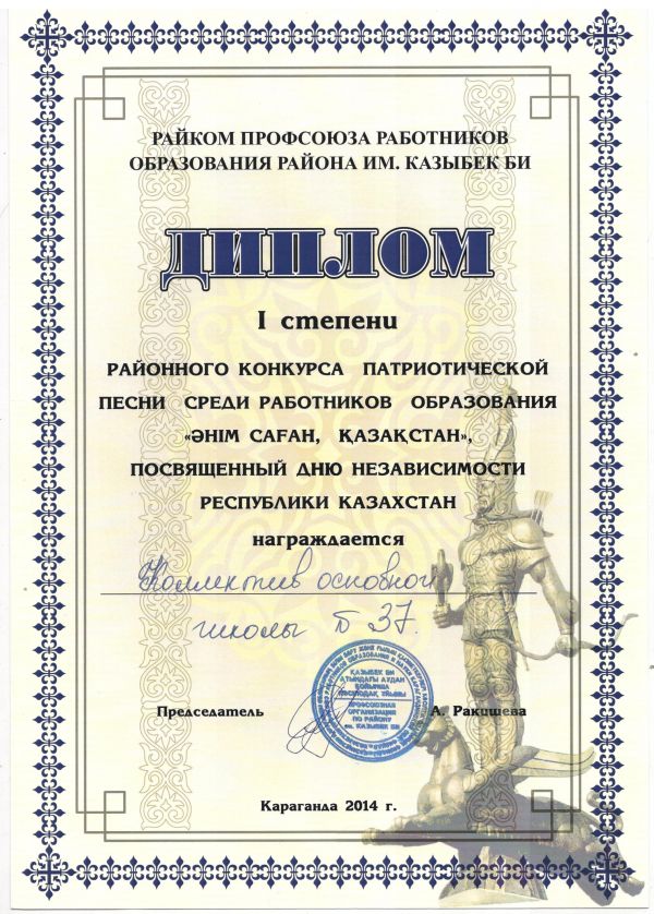 Поздравляем за занятое І место районного конкурса патриотической песни среди работников образования "Әнім саған, Қазақстан" посященной дню независимости Республики Казахстана.