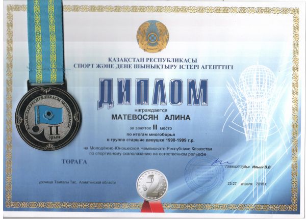 Поздравляем ученицу ОШ №37 Матевасян Алину за занятое ІІ место в виде скорость среди девушек 1998-1999г.р. на Чемпионате Республики Казахстан среди молодежи юношей по спортивному скалолазанию.