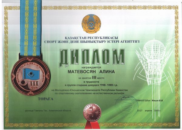 Поздравляем ученицу ОШ №37 Матевосян Алину за занятое ІІІ место в виде многоборью среди девушек 1998-1999г.р. на Чемпионате Республики Казахстан среди молодежи юношей по спортивному скалолазанию.
