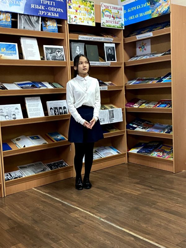 Нұркен Әбдіров атындағы ЖББМ кітапханасының оқу залында "Пушкин және Қазақстан" тақырыбына орыс тілі мен әдебит пәнінің мұғалімі Ахметова Г.П мен кітапханашы Калиева Г.С 9 &qu…
