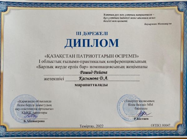 "Қазақстан патриоттарын өсіреміз" І облыстық ғылыми-практикалық конференциясының "Барлық жерде ерлік бар" номинациясы бойынша ІІІ орын иелегені үшін 1 "А" сынып оқушысы…