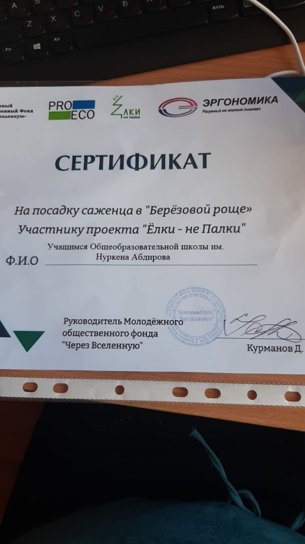 20 мамыр 2022 жылы Қарағанды қаласы, Тәуелсіздіктің 10 жылдық атты саябағында Курмашов Д. М 7 ә сынып оқушыларымен «Елки-не Палки» жобасына қатысып ағаш отырғызды.