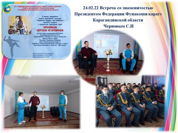 Сегодня 24.02.22 с учениками 9 класса состоялась встреча со знаменитостью - Черновым С.И. Президентом Федерации Фунакоши каратэ Карагандинской области.