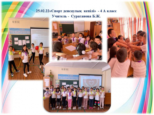 25.02.22 В рамках Недели спорта учитель начальных классов Сураганова Б.Ж в 4 А классе провела внеклассное мероприятие по теме «Спорт денсаулық кепілі».