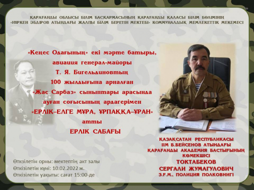 Согласно плана посвященной празднованию 100-летия дважды Героя Советского Союза, генерал-майора авиации Т.Я. Бигельдинова в библиотеке школы оформленуголок.Жас Сарбазы озна…