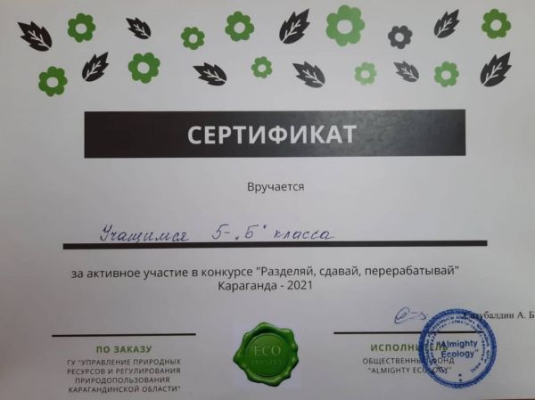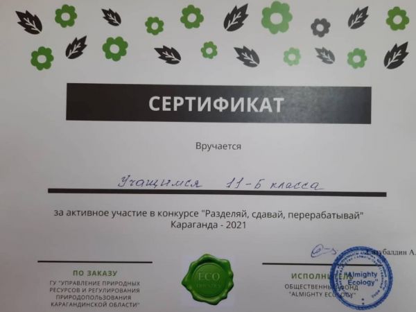 23 қарашада Н.Әбдіров атындағы мектепте макулатура және пластик жинау байқауы шеңберінде «Бөл, тапсыр, қайта өңде» жобасы бойынша «Almighty Ecology» Қ…