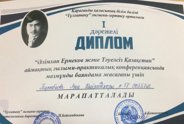 "Әлімхан Ермеков және Тәуелсіз Қазақстан” аймақтық ғылыми-практикалық конференциясында тарих пәнінің мұғалімі Тарыбаева Асем Кайраткызы І дәрежелі дипломмен марапатталды, Минбаева Нурдана…