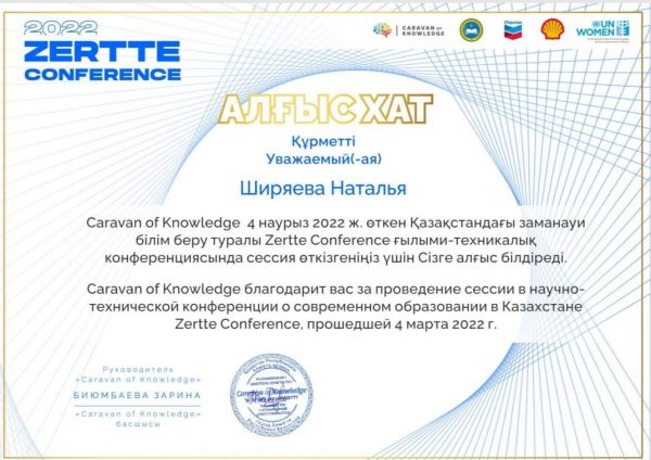 Преподавателями ОШ им.Н.Абдирова Хорошиловой Т.А. и Ширяевой Н.В. проведена коуч сессия на Республиканской научно-технической конференции Zertte Conference на тему: "Проектирование STEAM-уроков…