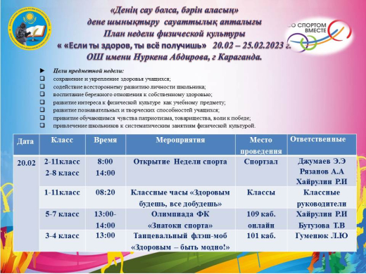 2023 жылдың 17 ақпанында мектебіміздің базасында Қарағанды облысымыздың білім бөлімінің «Жас Сарбаз» сынып оқушылары арасында II-қысқы Спартакиада аяқталды. Спартакиаданы ұй…