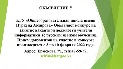 КГУ «ОШ им. Нуркена Абдирова» 02 февраля 2022 года состоялось заседание Попечительского совета.В целях ознакомления с коллективом…