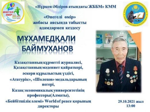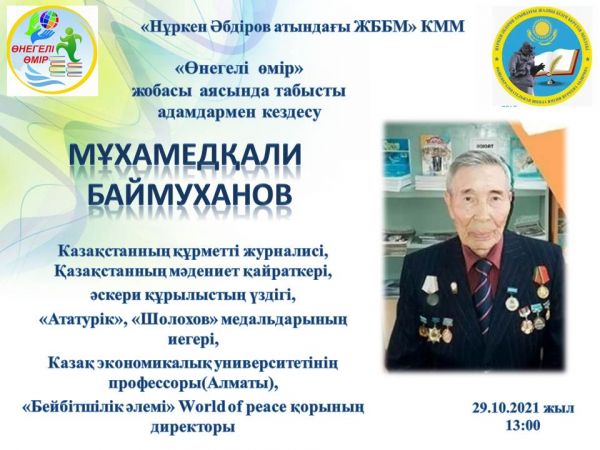 29.10.2021ж. мектебімізде "Өнегелі өмір" жобасы аясында 7 "А" Жас сарбаз сынып оқушыларының қатысуымен Қазақстанның құрметті журналисі, мәдени қайраткері, әскери құрылыстың үздіг…