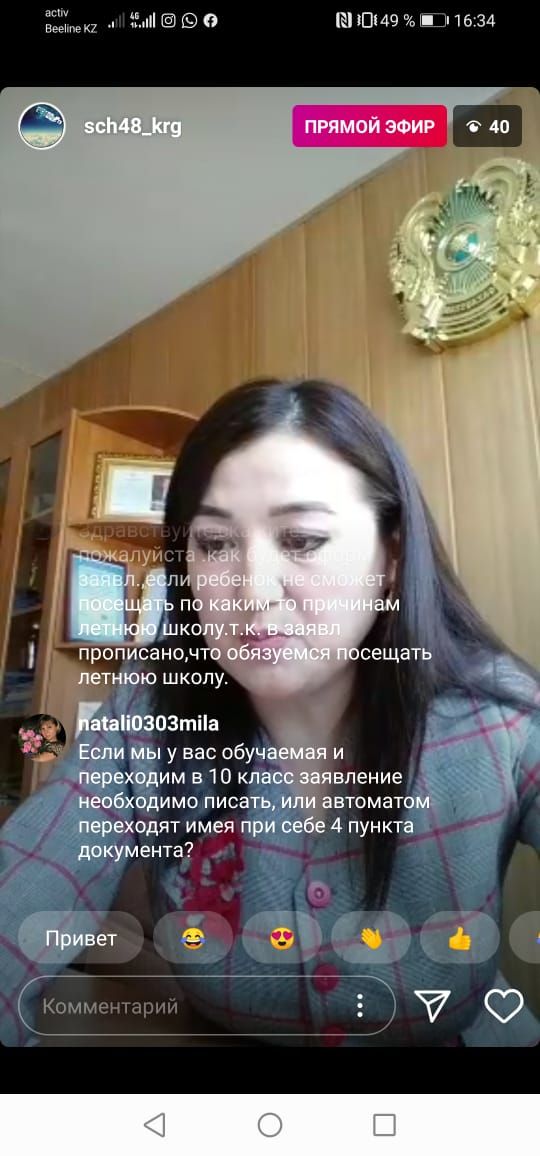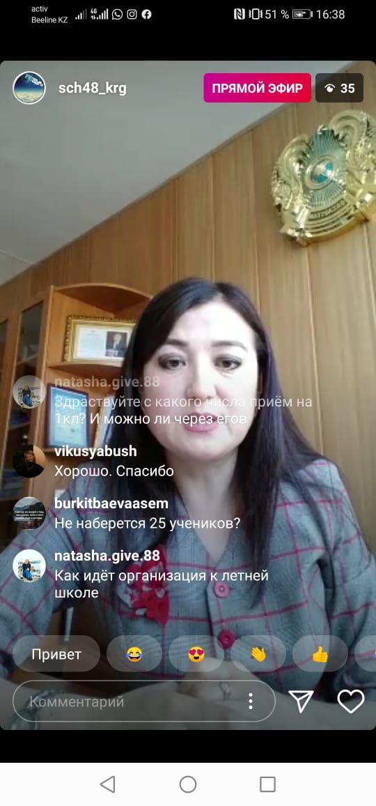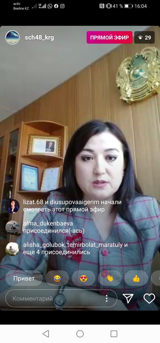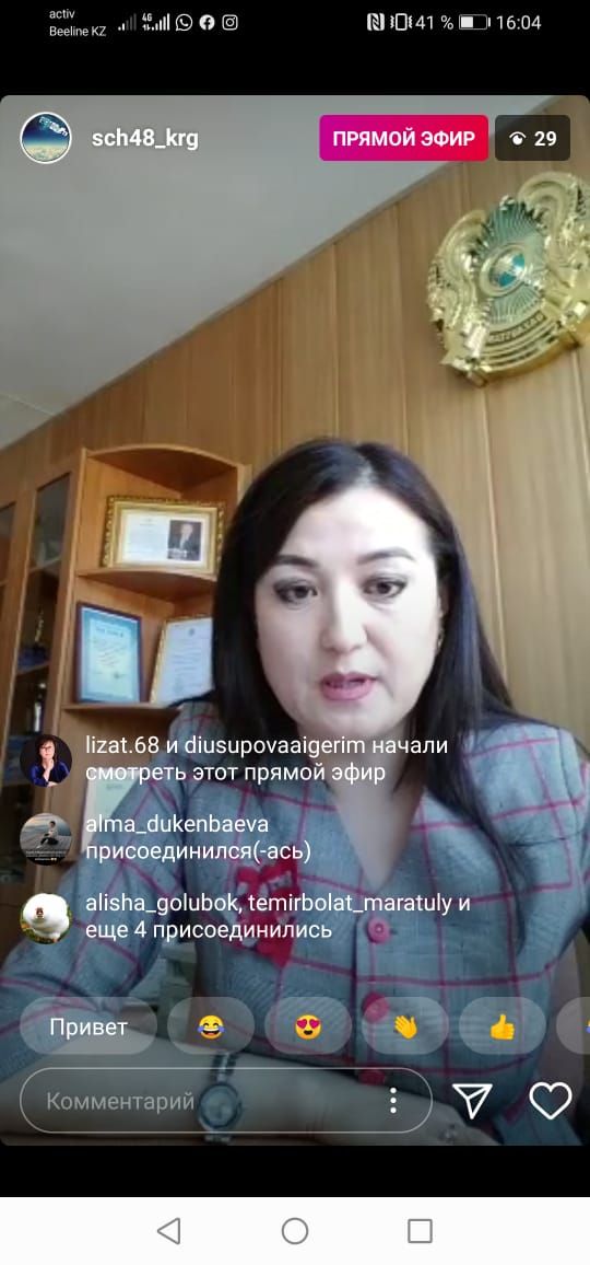 Мектеп директоры Алпысбаева А.Р. 21 мамыр 2021 жылы сағ:16:00-де sch48_krg Instagram парақшасында тікелей эфирде ата-аналарға арналған "Басшы сағаты" өткізді.