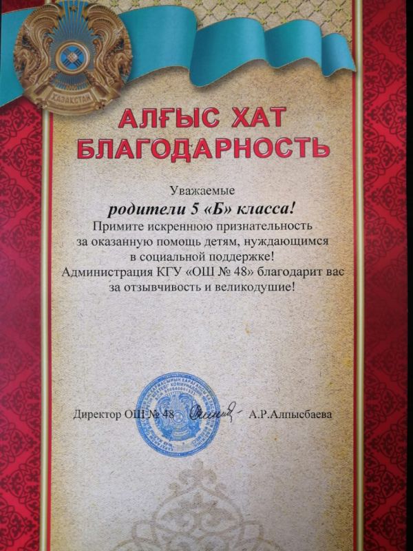 родителей 5 «Б» и учителя казахского языка Исину М.К. за оказанную помощь детям из многодетных и опекаемой семьи. Они ока…