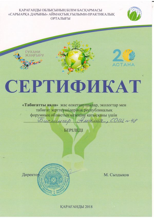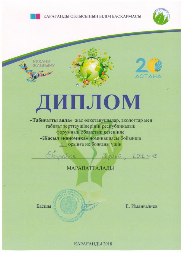 11 мамырда жалпы, орта және қосымша білім берудің оқушылары арасында Аймақтық экологиялық форум өткізілді. Біздің мектептің оқушылары: Боровок Сергей және Бийакин Сергей және Бислингер Амалия, &laqu…