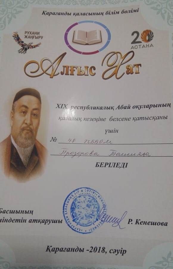 26 сәуірде 19 Республикалық Абай оқулары қалалық кезеңі өтті. Өзінің шығармашылығы номинациясы бойынша 6 сынып оқушысы Татьяна Трубникова 2-ші орынды иеленді. 6B сынып оқушысы Прозорова Таисия …