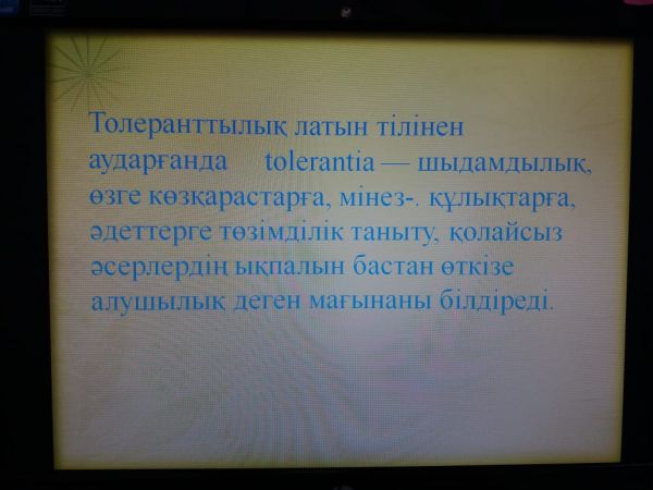 Атты 11А сыныбында сынып сағаты өтті. Толеранттылық туралы түсінік берілді. Көпұлтты Қазақстан Республикасындағы ішкі саяси тұрақтылықтың кепілі этникалық және діни татулықтың қажеттілігін ұғындыра…