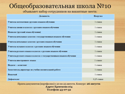 Общеобразовательная школа №10 объявляет набор сотрудников на вакантные места