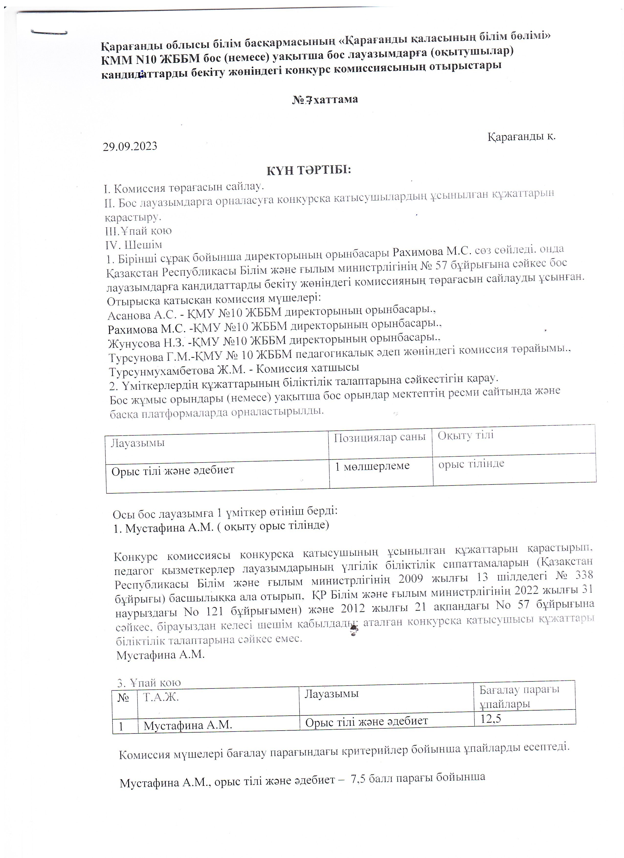По итогам работы конкурсной комиссии КГУ ОШ № 10 согласно 57 приказу МОН РК победителем на вакантную должность учителя русского языка и литературы является Мустафина А.М.