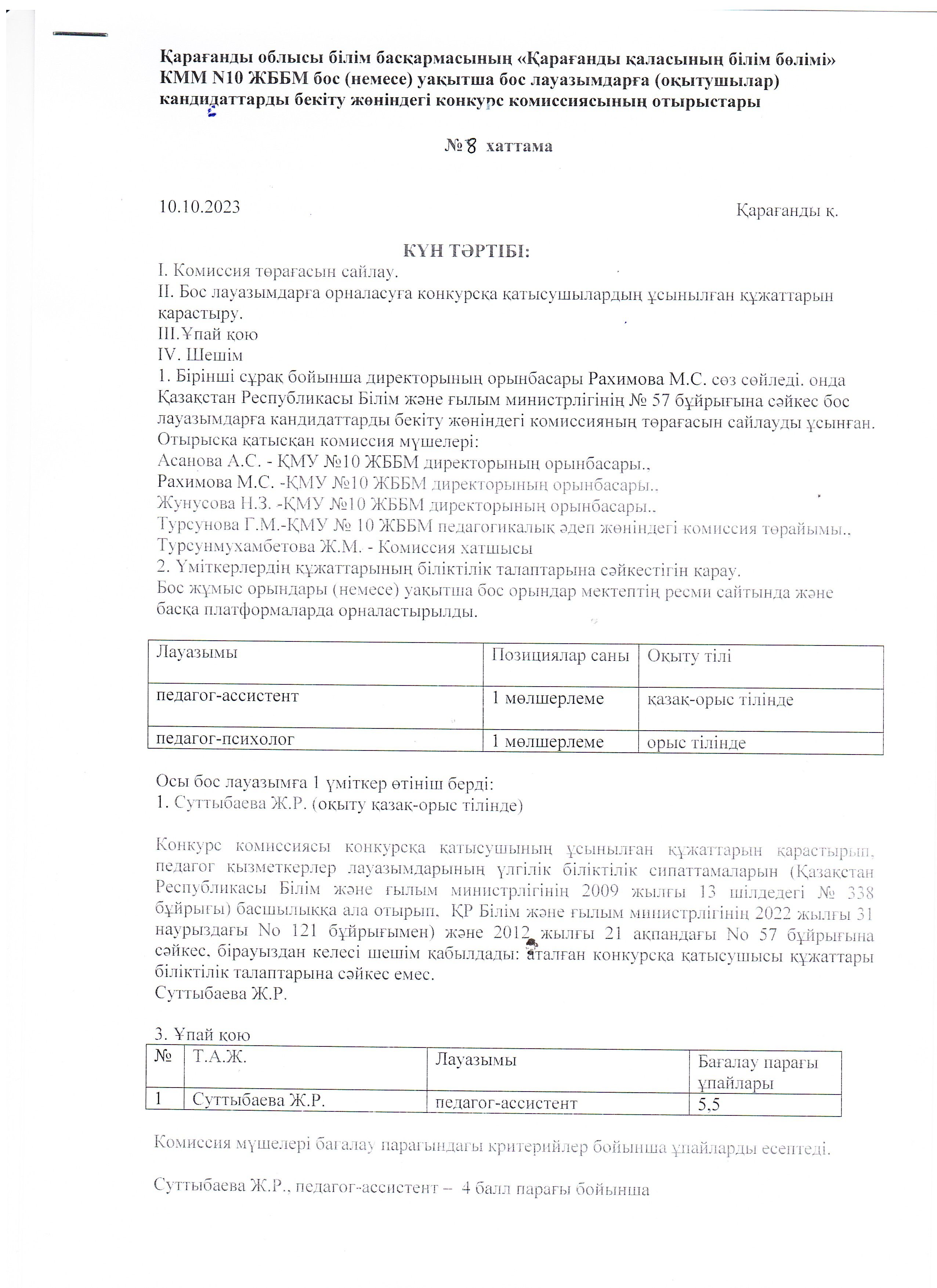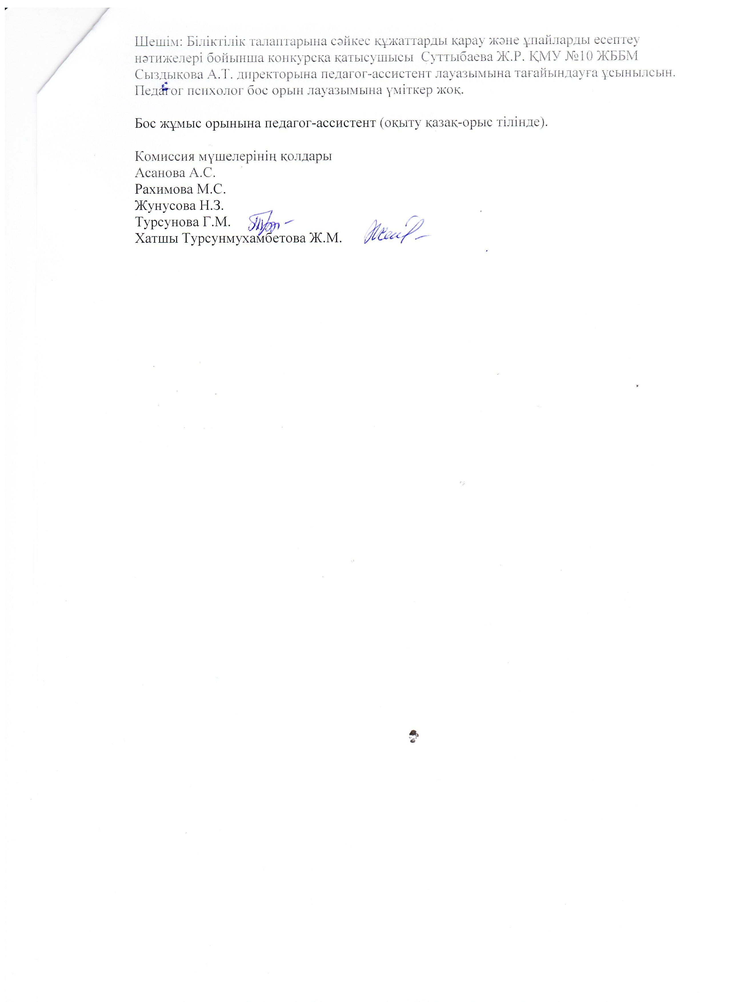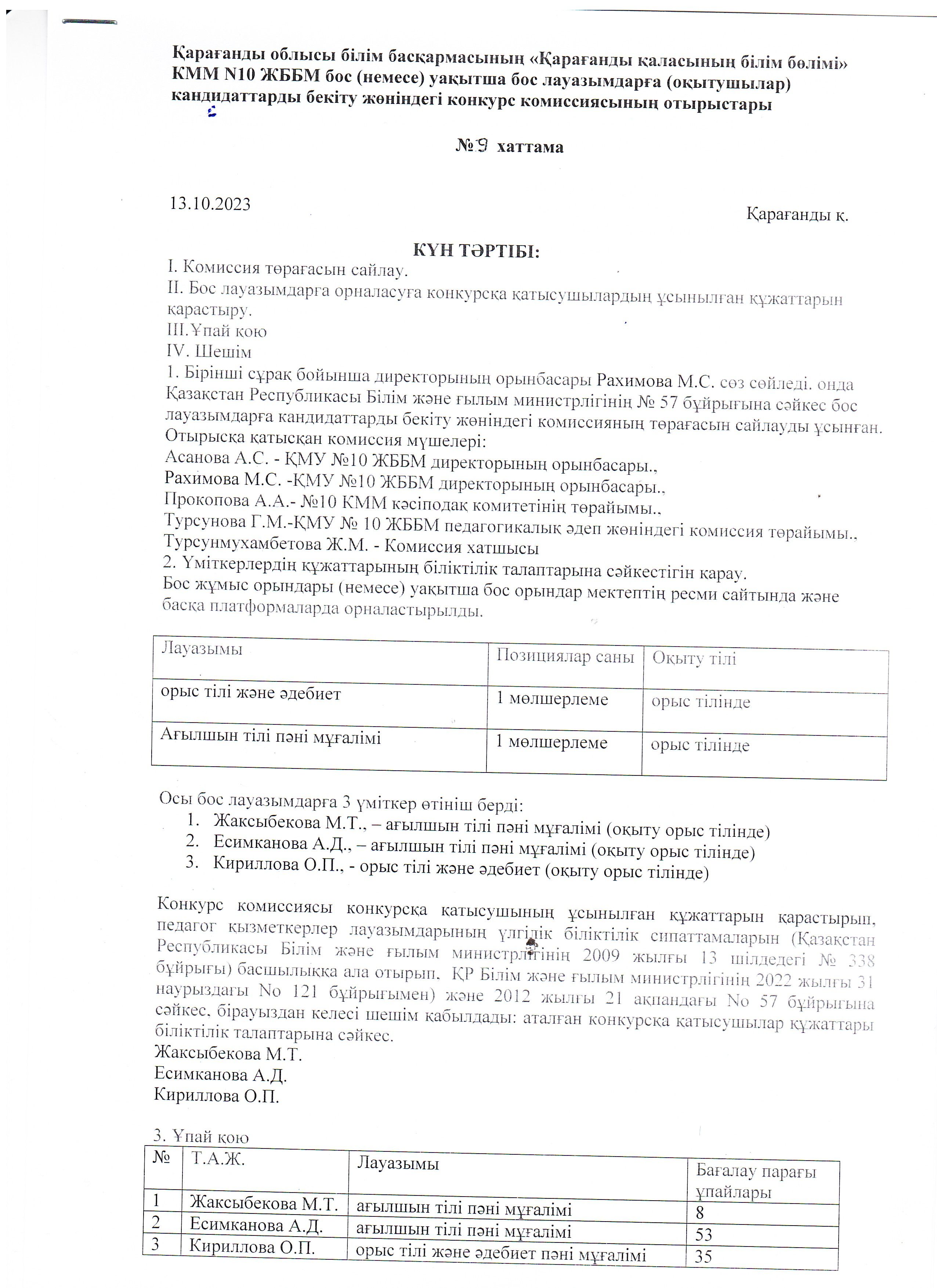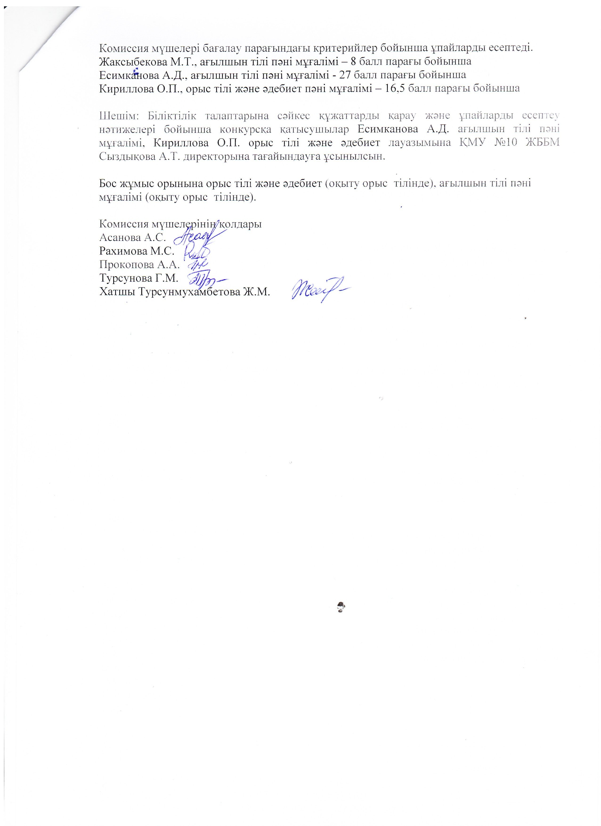 По итогам работы конкурсной комиссии КГУ ОШ № 10 на осно…