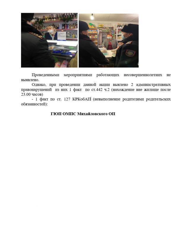 Информация о результатах работы по проведению на обслуживаемой территории Михайловского ОП УП г. Караганды акции «Дети в ночном городе» 11.12.2020 г.