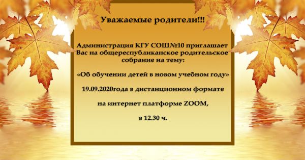 Администрация КГУ СОШ №10 приглашает Вас на общереспубликанское родительское собрание 19.09.2020 года в 12.30ч. В дистанционном формате на интернет платформе ZOOM.