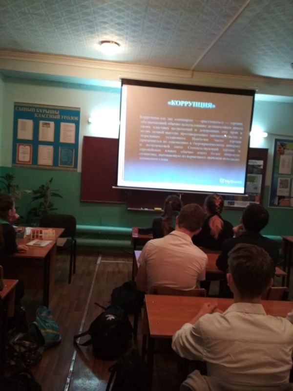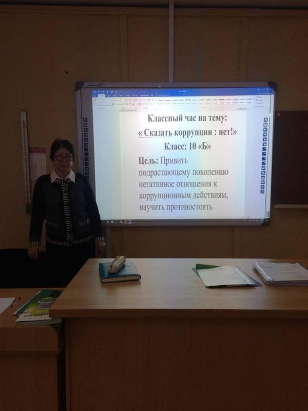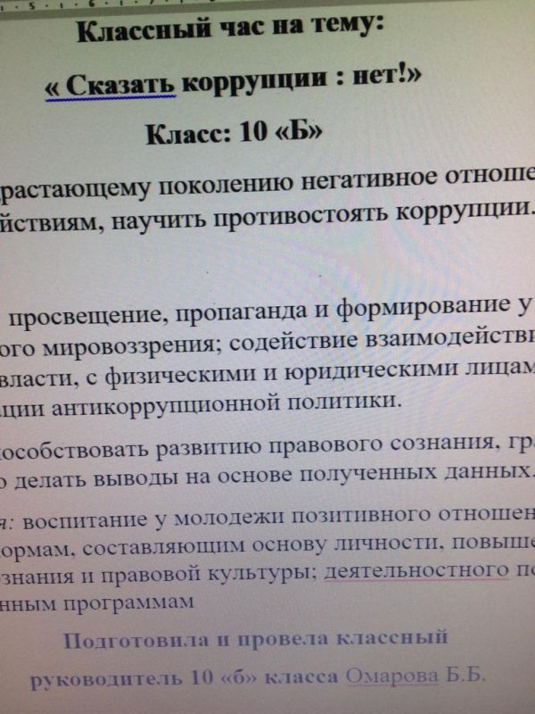 3 жетоқсан күні, "Халықаралық сыбайлас жемқорлықпен күрес" атты тақырыпта 10 "А" сынып сағатын өткізді, сабақ барынсында бейнероликтер көріп, түсінгендерін кластер түрінде жасады