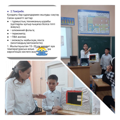 5 "Ә" сыныбы оқушыларының жаратылыстану сабағында "Жылуды оқшаулау" тақырыбы бойынша үй тапсырмасына берілген тәжірибе жұмысын қорғау барысы. Жылуды тұрақты ұстап тұратын заманау…