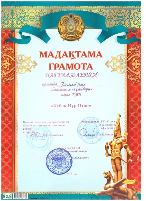 16 марта 2017 года на базе ДК г. Сарань прошла региональная игра КВН на Кубок "Нұр Отан". В игре приняли участие команды из города Караганда, Темиртау и Сарань. …