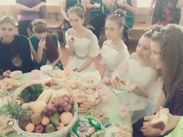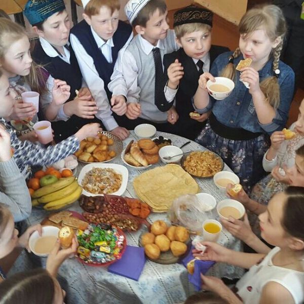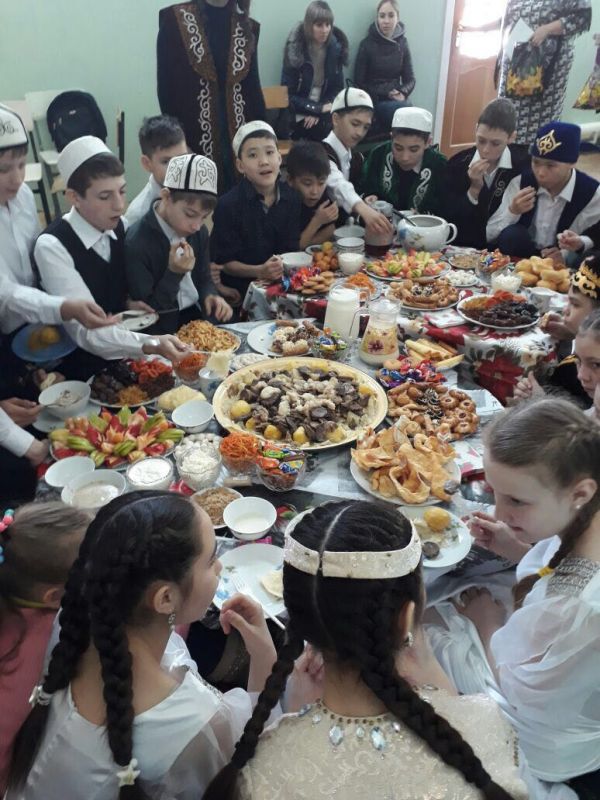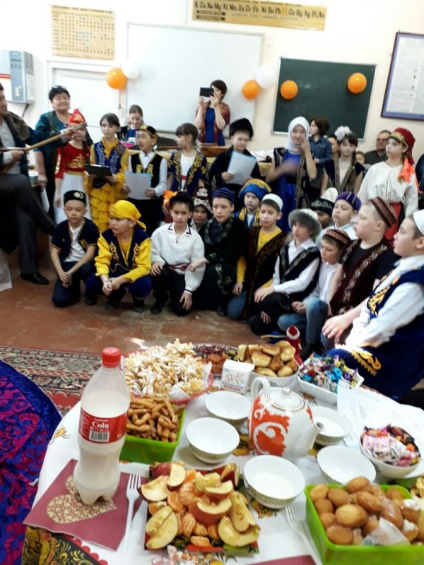 Девочки 9б класса накрыли дастархан, где главным блюдом были баурсаки, приготовленные мамой Джиенкуловой Самал. Францен Маргарита исполнила танец "Камажай", звучали песни, музыка, гости получили тюль…