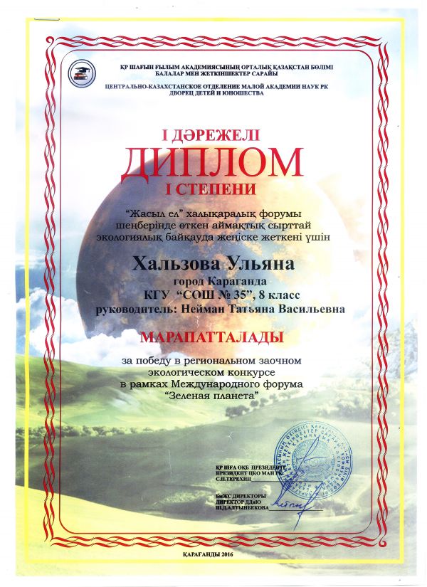 Диплом 1 степени получила ученица 8Б класса Хальзова Ульяна за победу в заочном региональном экологическом конкурсе в рамках Международного форума «Зелёная планета&…